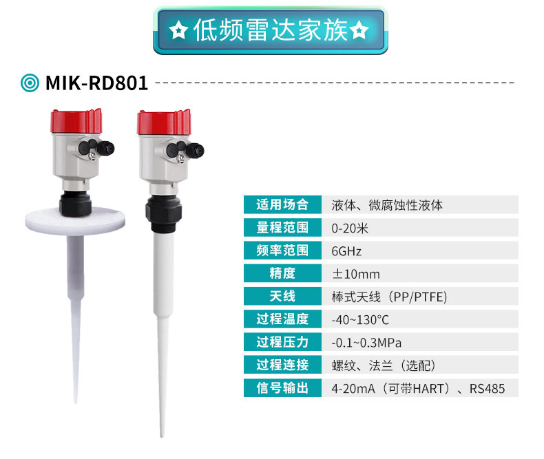 適用場(chǎng)合:米科MIK-RD80系列低頻雷達(dá)液位計(jì),新型快速的微處理器可以進(jìn)行更高速率的信號(hào)分析處理,使得儀表可以用于水液儲(chǔ)罐、酸堿儲(chǔ)罐、漿料儲(chǔ)罐、固體顆粒、小型儲(chǔ)油罐,以及各類導(dǎo)電、非導(dǎo)電介質(zhì)、腐蝕性介質(zhì),還有如煤倉(cāng)、灰倉(cāng)、油罐、酸罐等一些復(fù)雜的測(cè)量工況。